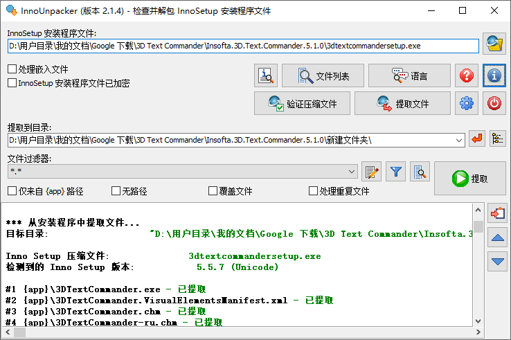 要处理的可执行安装程序文件可通过文件选择对话框、拖放或使用命令行加载。基本文件信息和包含文件列表将立即显示。要提取文件只需点击相应的按钮并选择目标目录即可。可指定过滤器以仅提取匹配的文件(可选)。支持最高版本 v6 的 InnoSetup 安装程序文件。
